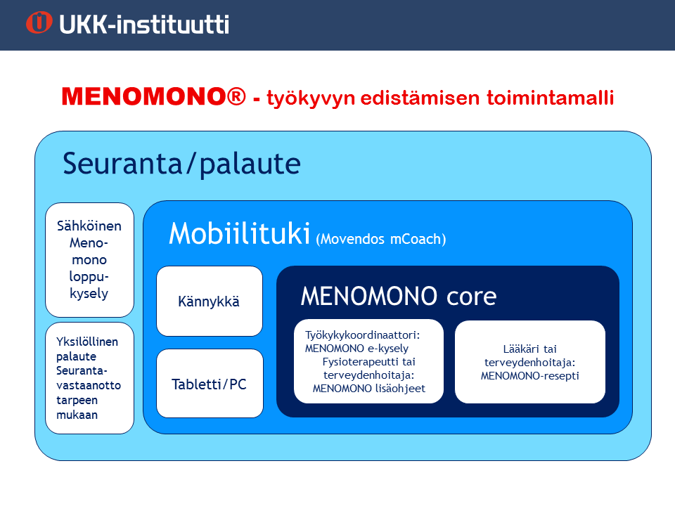 Menomono® on UKK-instituutin kehittämä, työ- ja toimintakyvyn edistämisen tutkimuksiin perustuva toimintamalli. Menomonon® tavoitteena on hoitaa ja ehkäistä sairauksia, vähentää oireita ja parantaa elämänlaatua ja työkykyä liikuntaa lisäämällä ja liikkumattomuutta vähentämällä.